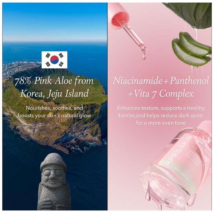 • 78% Aloe Rosa de Jeju: Hidrata, calma y repara la piel.